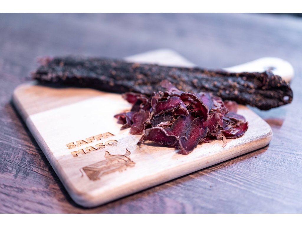 Na rozdíl od klasického jerky je biltong sušen přirozeným prouděním vzduchu, díky čemuž si zachovává jemnější texturu, výraznější chuť a přirozené živiny.