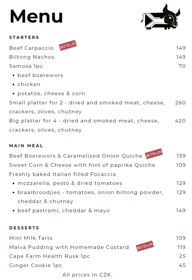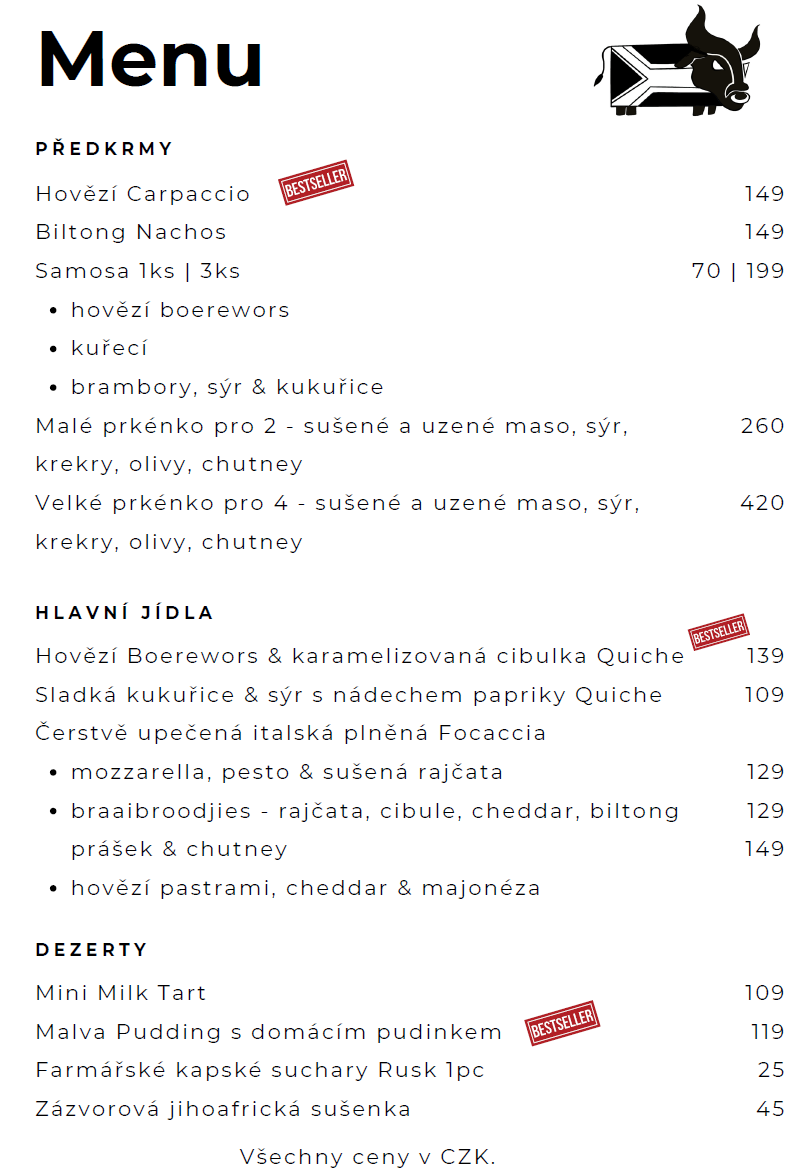 Každý víkend také připravujeme speciální jihoafrickou nabídku tradičních jídel. Pro aktuální nabídku sledujte naše sociální sítě.