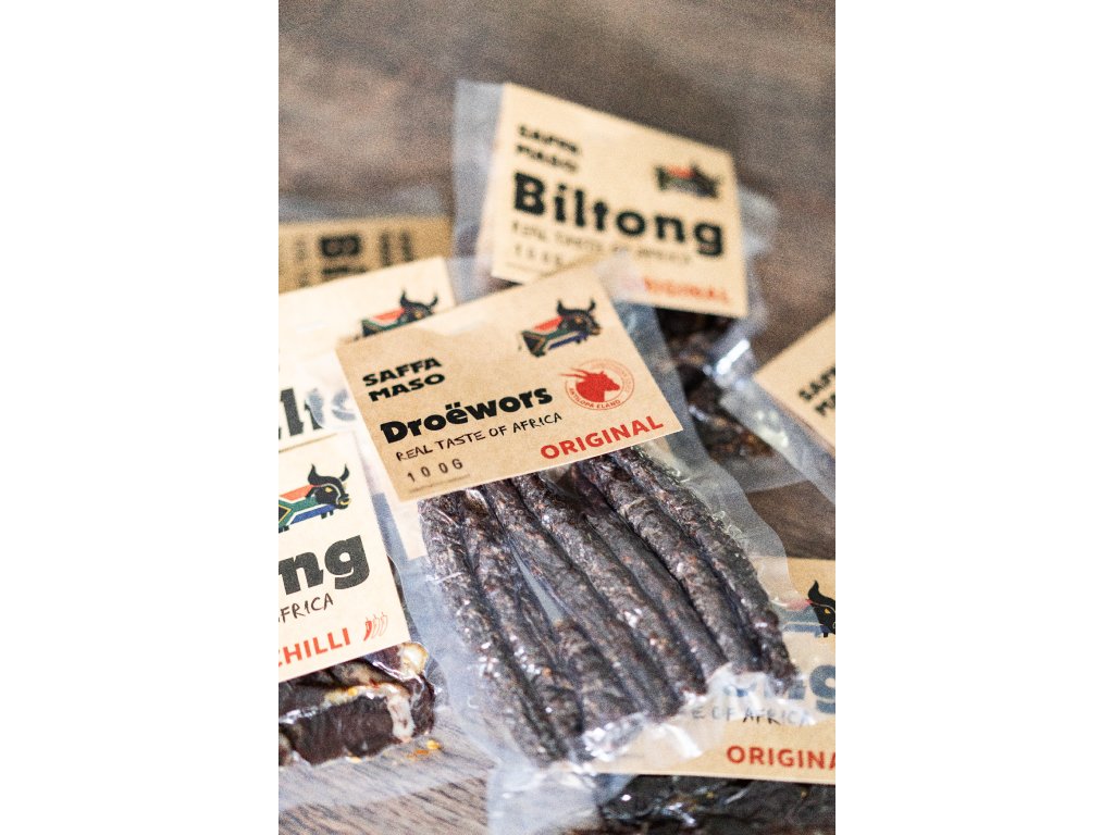 Droëwors Eland – sušené antilopí klobásky, tepelně neopracovaný masný výrobek